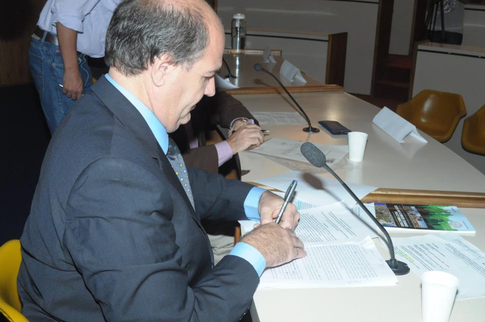 A PUC-Rio foi designada para celebrar o Dia Mundial do Habitat de 2011 no Rio de Janeiro. Na imagem, Alain Grimard, diretor da ONU HABITAT na América Latina e Caribe, firma o compromisso das Nações Unidas com a Universidade.