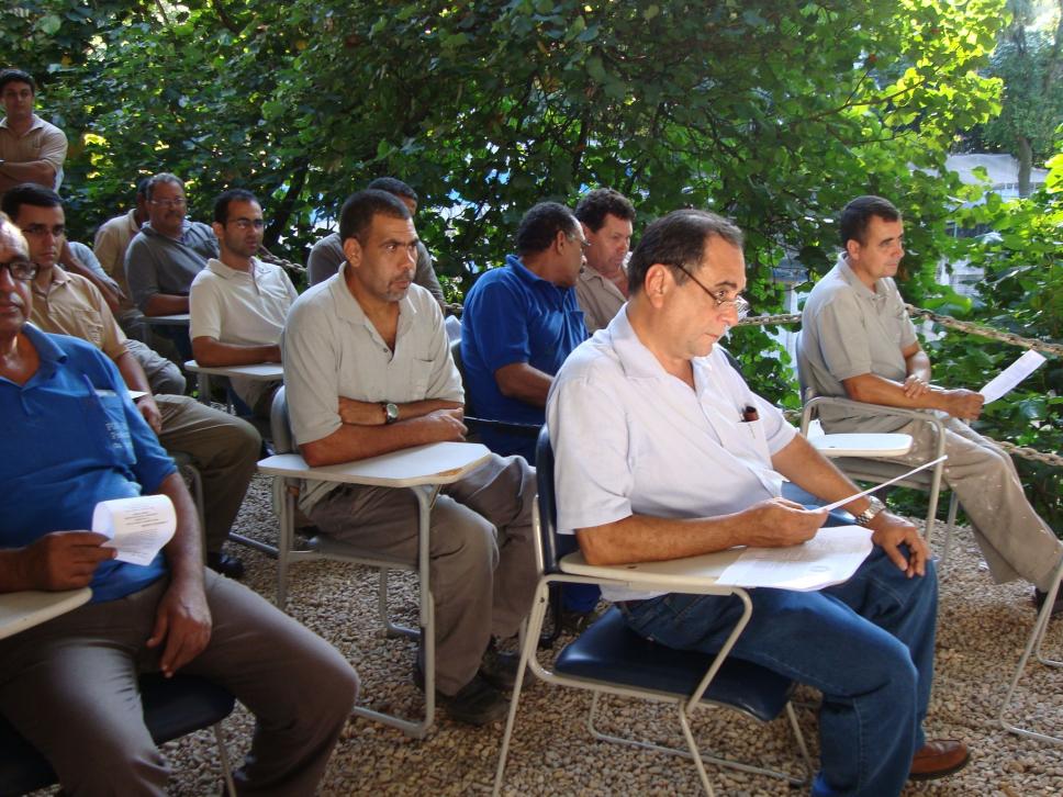 O prefeito do campus, Eduaurdo Lacourt, e funcionários da PUC-Rio acompanham a missa ao Dia de São José Operário - 1 de maio - realizada dois dias depois, em frente às oficinas da Universidade.