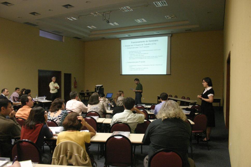 Seminário de preparação do Plano de Desenvolvimento Institucional (PDI) PUC-Rio 2008-2012. O Professor Luiz Silva Mello, coordenador da CCPA (Coordenação Central de Planejamento e Avaliação), apresenta o funcionamento do seminário aos professores da Universidade.