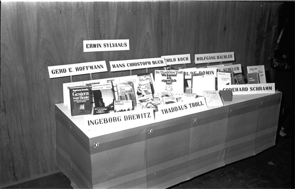 Exposição de livros de Erwin Silvanus, Gerd Hoffmann, Hans Christoph Buch, Thilo Koch, Ingeborg Brewitz, Thaddaus Troll e Godehard Schramm, entre outros, no hall do Auditório do RDC.