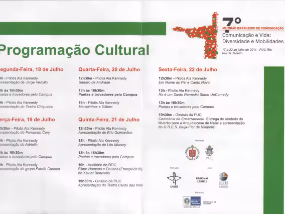 Folder e série de fotografias do 7° MUTICOM - Mutirão Brasileiro de Comunicação -, realizado no campus da PUC-Rio. Este sequencial compõe-se de fotos que registram os seis dias do evento, a missa, a cerimônia de abertura, o ciclo de palestras e as atividades culturais desenvolvidas, além do folder com a programação dessas atividades.