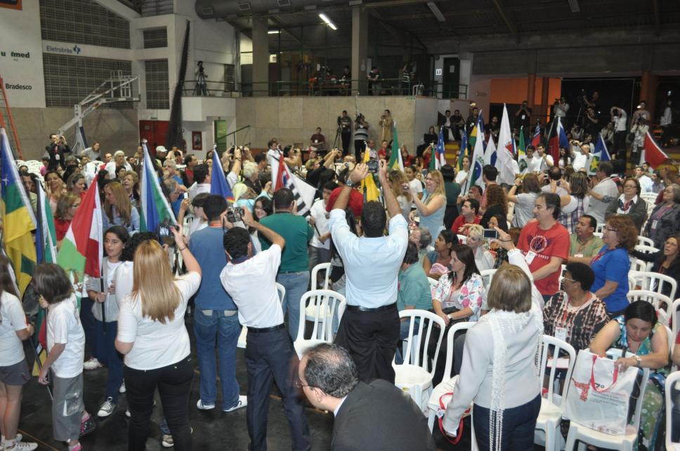 Conferência de abertura do 7° MUTICOM - Mutirão Brasileiro de Comunicação. Apresentação dos alunos do Colégio Notre-Dame, desfilando com as bandeiras dos estados brasileiros.