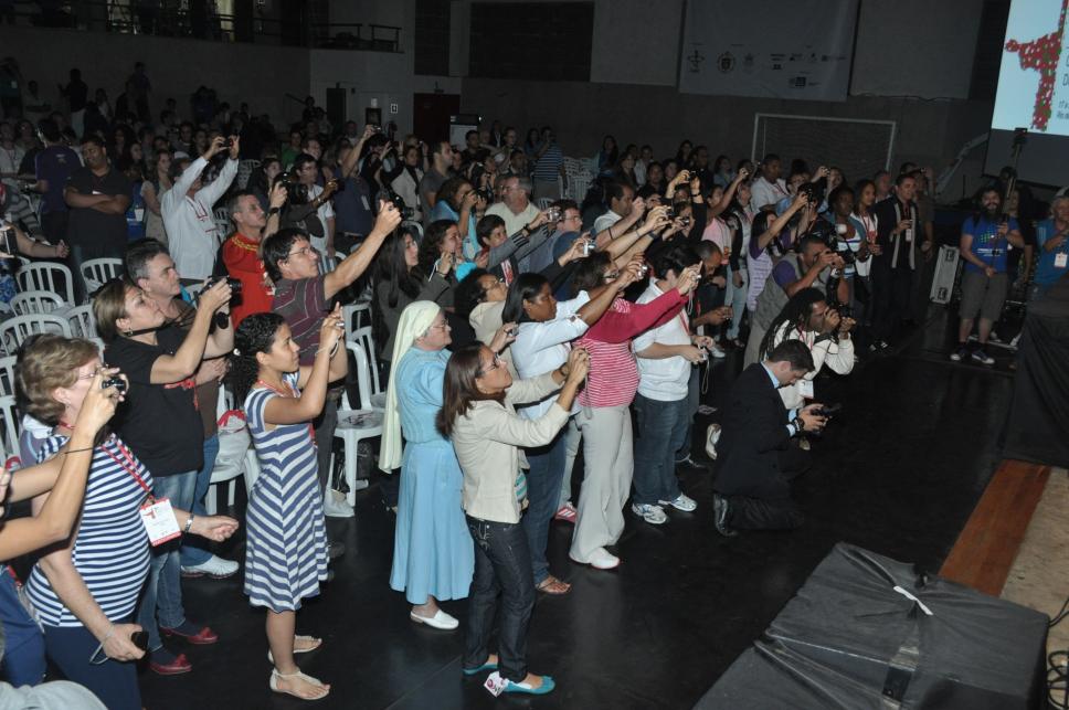 A plateia acompanha de pé e registra como pode a apresentação da escola de samba Beija-Flor de Nilópolis, que encerrou as atividades do 7° MUTICOM - Mutirão Brasileiro de Comunicação.