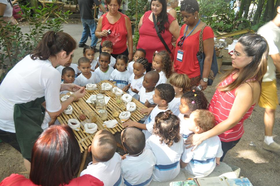 Jovens estudantes de escola pública observam manipulação de alimentos.