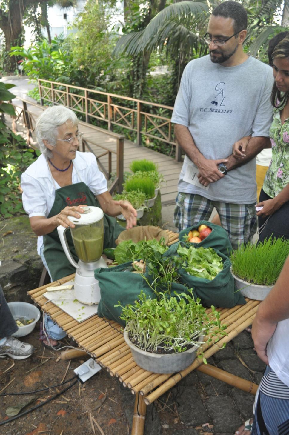 Professora Ana Branco observada enquanto bate alimentos no liquidificador.