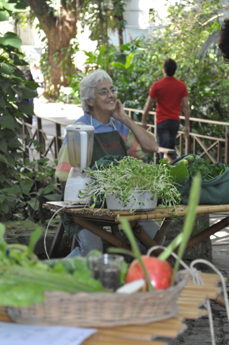 Produtos expostos na feira. Ao fundo, professora Ana Branco manipula alimentos.