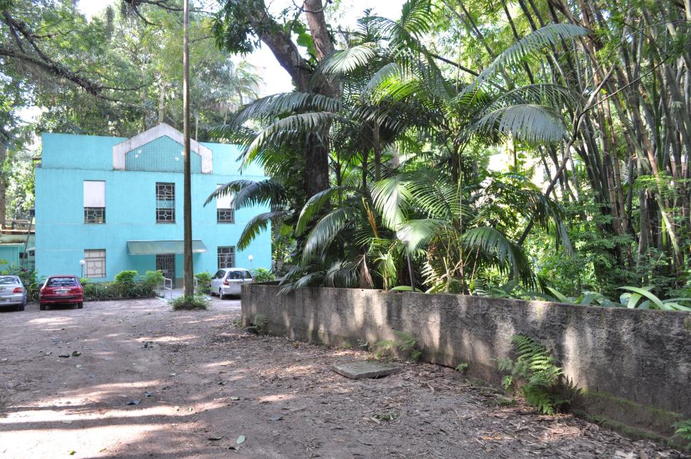Vegetação localizada no terreno do IOPUC. Ao fundo, prédio e estacionamento..
