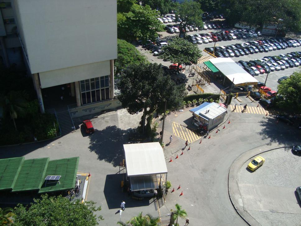 Imagem a partir do alto. Vê-se o bicicletário, o portão principal, o prédio Frings e parte do estacionamento.