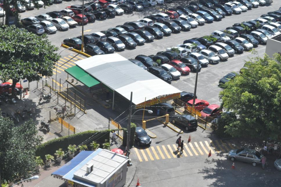 Imagem a partir do alto. Vê-se a entrada do estacionamento principal.