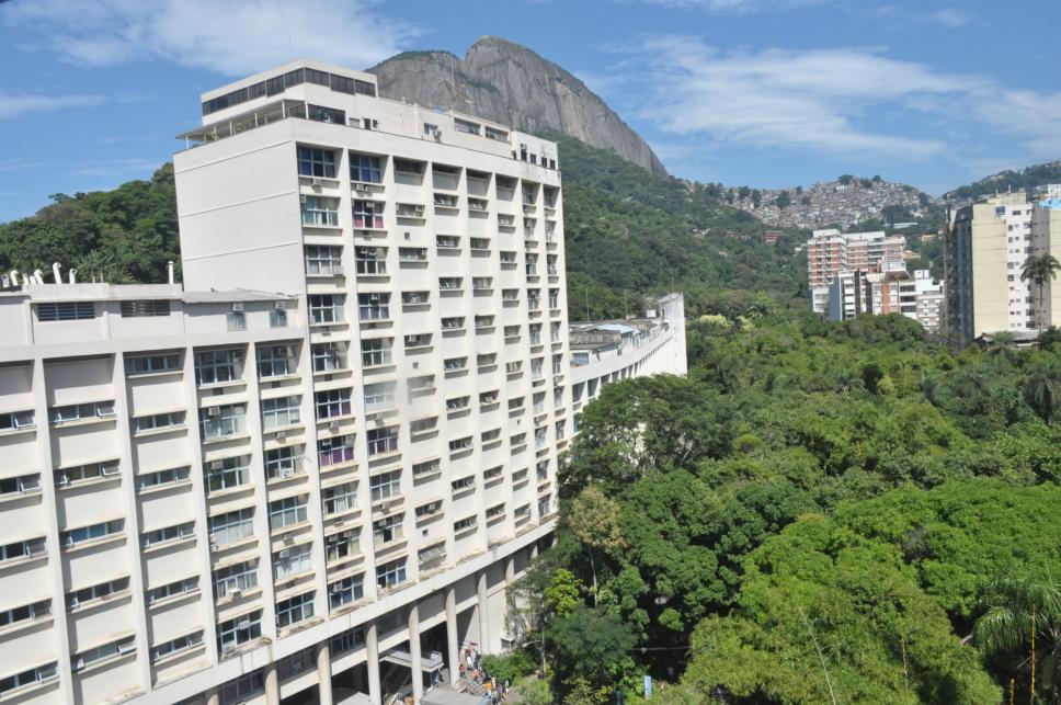 Edifício Cardeal Leme. Ao fundo, o Morro Dois Irmãos e a Rocinha.