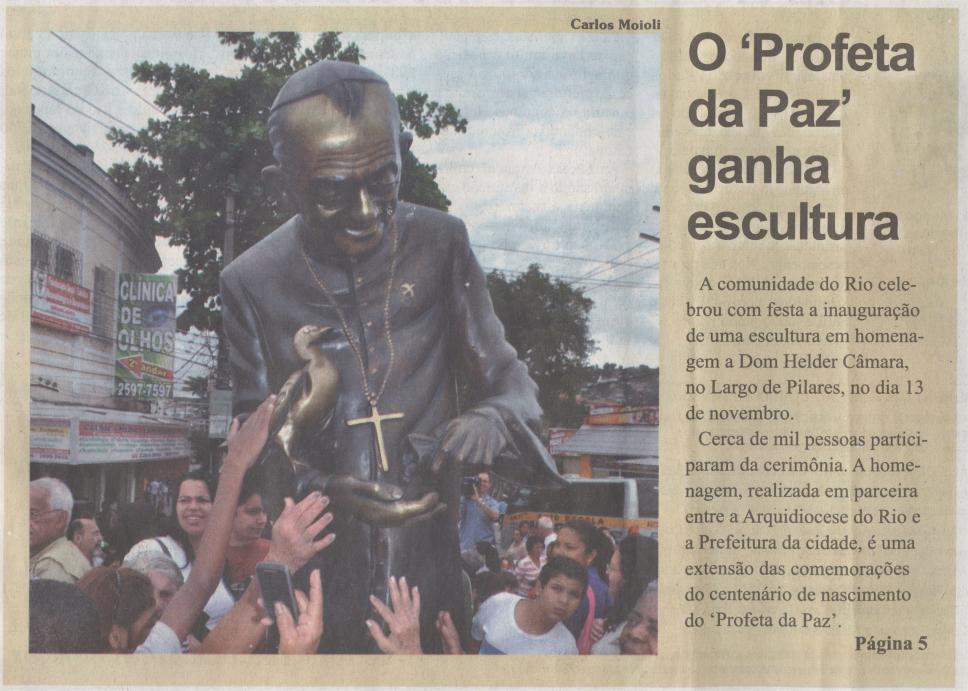 Artigo do jornal O Testemunho da Fé, 'O 'Profeta da Paz' ganha escultura'