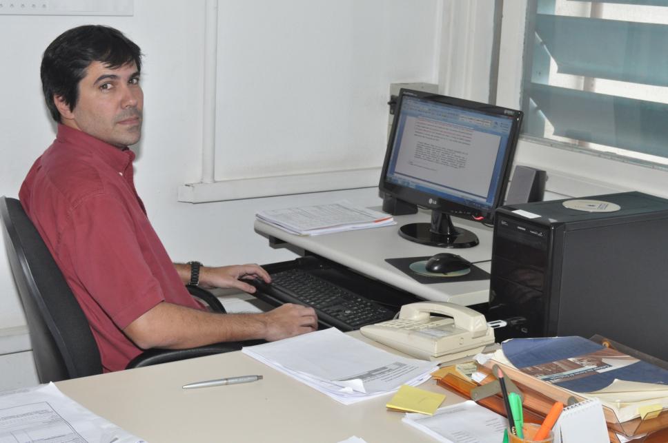 O prof. Leonardo Affonso de Miranda Pereira em sua baia no Departamento de História.