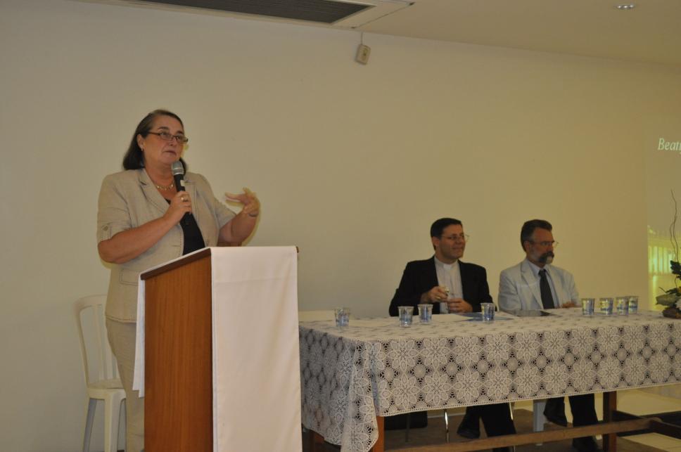 A profa. Maria Clara Lucchetti Bingemer palestra durante homenagem pela Beatificação do Papa João Paulo II.