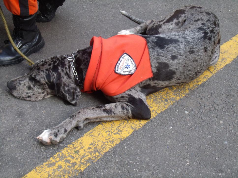 Cão mascote da Patrulha Civil descansa durante atividade realizada no campus.