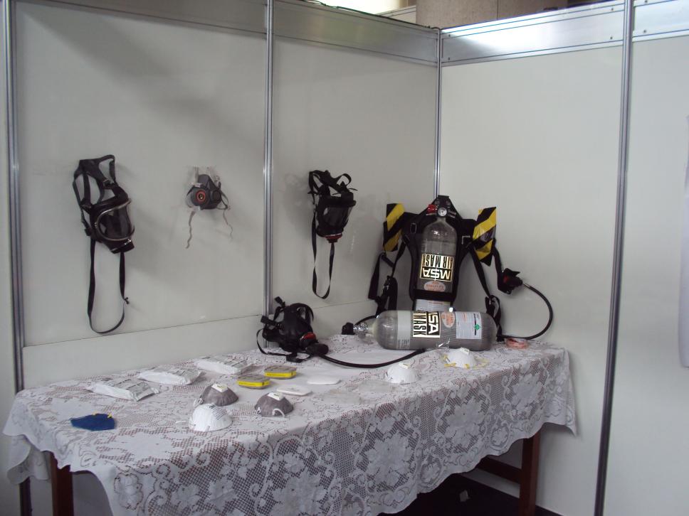 Equipamentos expostos durante a Semana Interna de Prevenção de Acidentes do Trabalho. Máscaras e cilindros de ar.