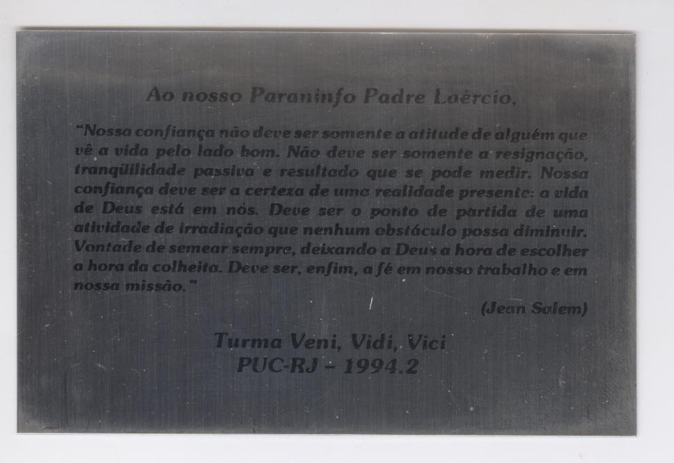 Placa concedida ao pe. reitor Laércio Dias de Moura S.J. por formandos [curso não identificado] do segundo semestre de 1994.