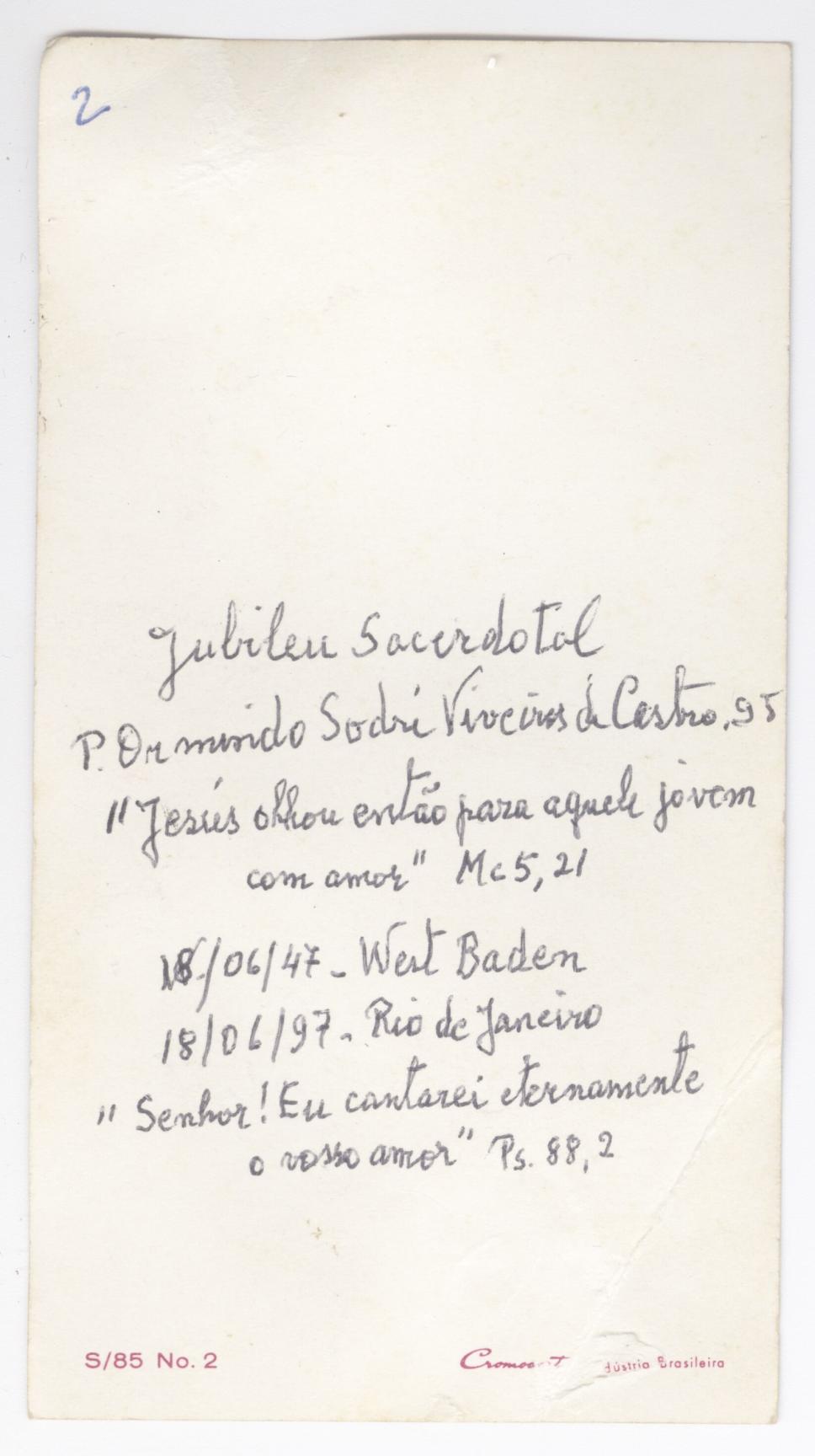 Verso do cartão em homenagem ao jubileu sacerdotal do pe. Ormindo Sodré Viveiros de Castro S.J. (18/06/1947 - 18/06/1997).