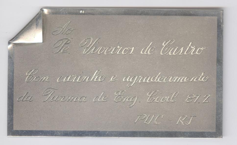 Placa concedida ao pe. Ormindo Sodré Viveiros de Castro, S.J. pelos formandos em Engenharia Civil do ano de 1987.