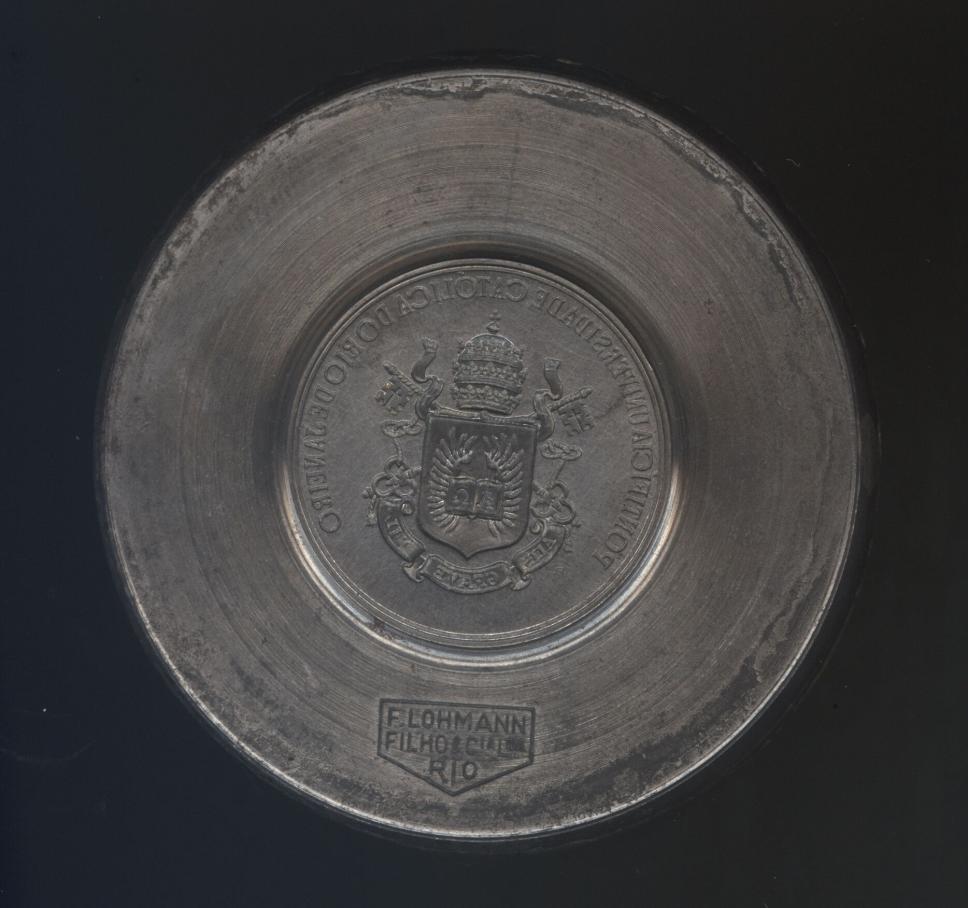 Cunho de medalhas com o brasão da PUC-Rio. Parece ser o verso da medalha do Prêmio Prof. Lacerda de Almeida, jurista e professor, ligado a Centro Dom Vital, falecido em 1943.