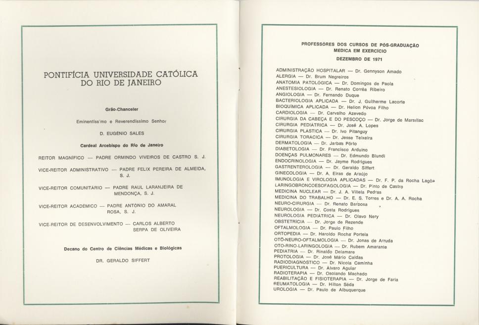 Páginas internas com a Administração Central da Universidade e a lista dos professores dos cursos de pós-graduação médica em dezembro de 1971