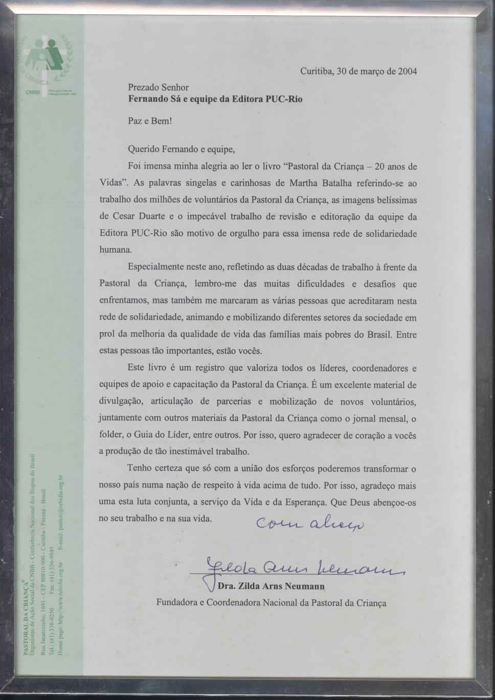Carta de Zilda Arns, coordenadora nacional da Pastoral da Criança, à equipe da Editora PUC-Rio.
