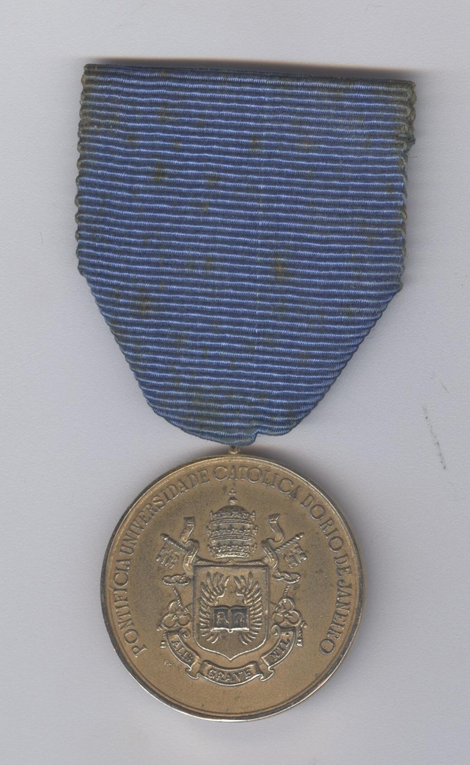 Medalha com o brasão da PUC-Rio, sem data, com um padrão de brasão intermediário. Verso de medalha do Prêmio Prof. Lacerda de Almeida. Talvez refira-se a "Francisco de Paula Lacerda de Almeida", jurista e professor, ligado a Centro Dom Vital, falecido em 1943.