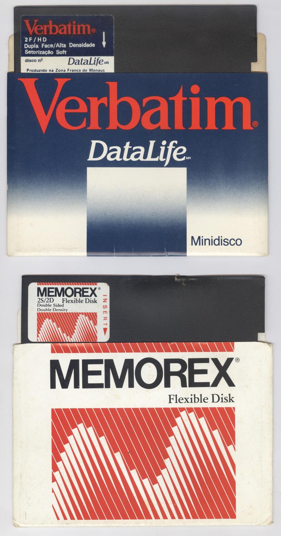 Disquetes de 5 1/4 polegadas nas suas capas.