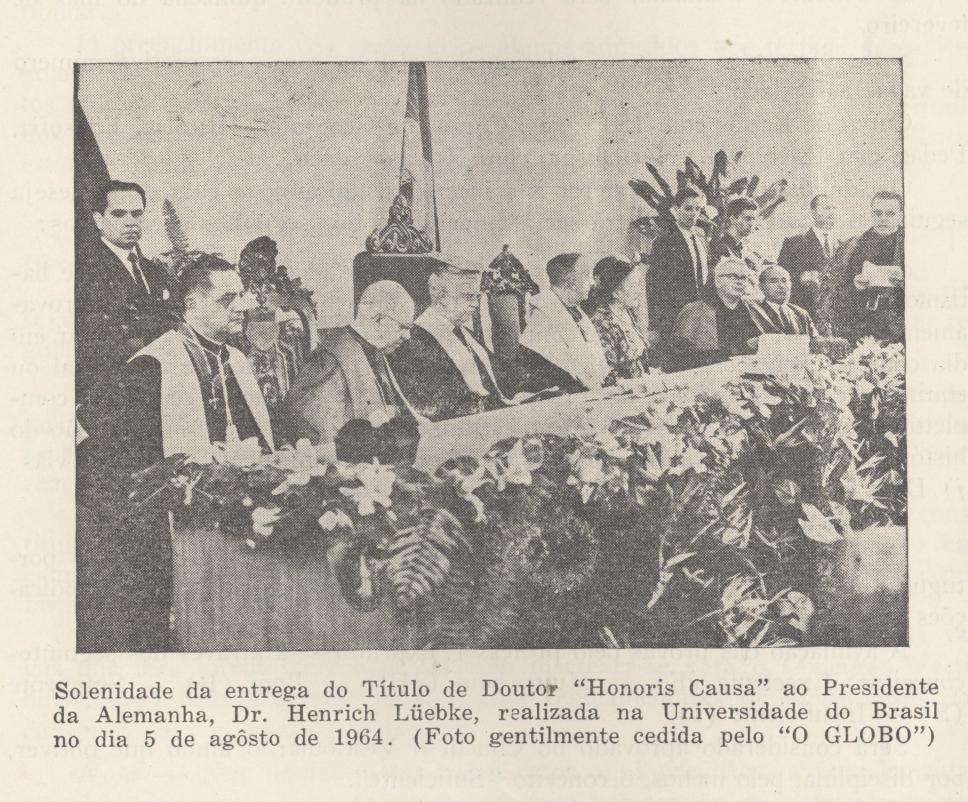 Foto da cerimônia de entrega do título Honoris Causa da UB e da PUC-Rio ao Presidente da Alemanha, Henrich Lüebke, na Universidade do Brasil. O evento foi realizado, contudo, não em 5 de agosto, mas em 15 de maio de 1964. Na solenidade também estavam o reitor da PUC-Rio, prof. pe. Laércio Dias de Moura S.J., e o reitor da Universidade do Brasil e professor da Faculdade de Direito da PUC-Rio, prof. Pedro Calmon.