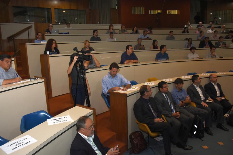 Palestrantes convidados sentados na primeira fila e plateia presente ao evento.