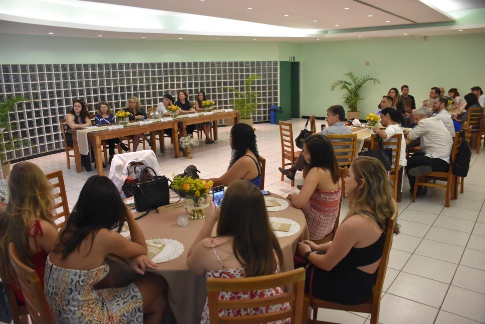 Na mesa horizontal da esq. para dir.: profa. Manuela Trindade; profa. Mônica Herz; profa. Marta Fernández; profa. Carolina Moulin; profa. Andrea Hoffman (coord. MAPI); profa. Isabel Siqueira.