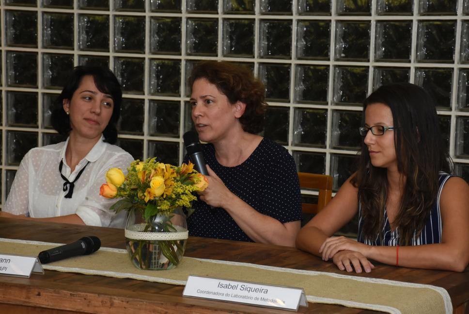 Da esq. p/ dir.: profa. Carolina Moulin; profa. Andrea Hoffmann (coordenadora MAPI/IRI); profa. Isabel Rocha de Siqueira (IRI)