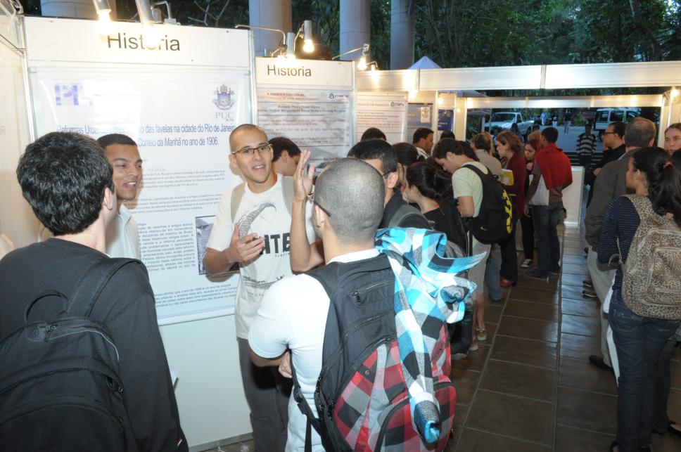 Bolsistas de iniciação científica do Departamento de História durante a apresentação de posters sobre suas pesquisas.