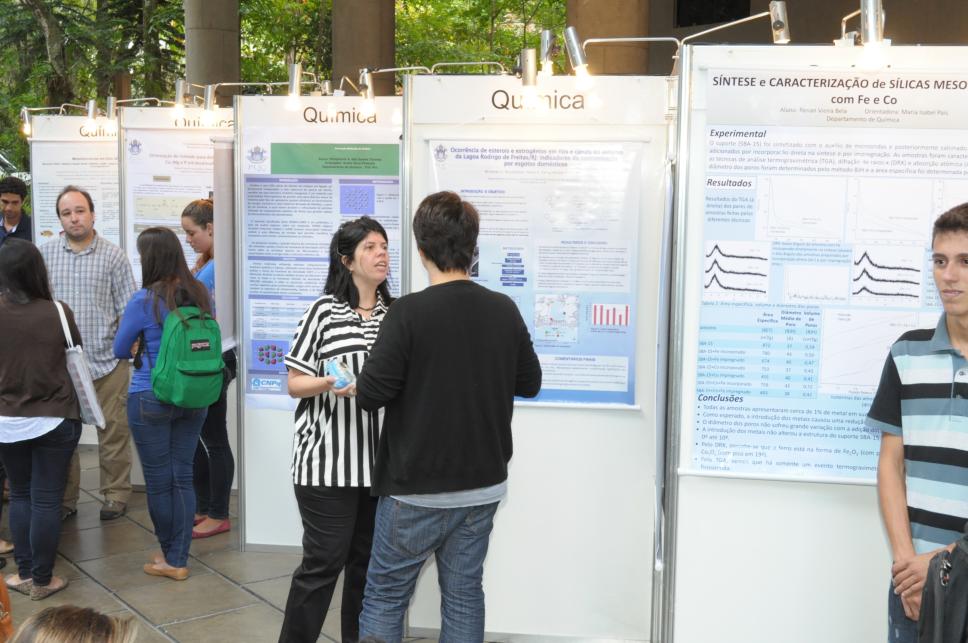 Bolsistas de iniciação científica do Departamento de Química durante a apresentação de posters sobre suas pesquisas.