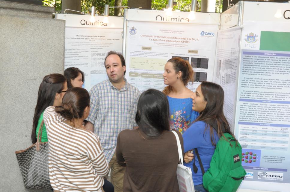 O professor André Silva Pimentel assiste as apresentações dos posters dos bolsistas de iniciação científica do Departamento de Química da PUC-Rio.