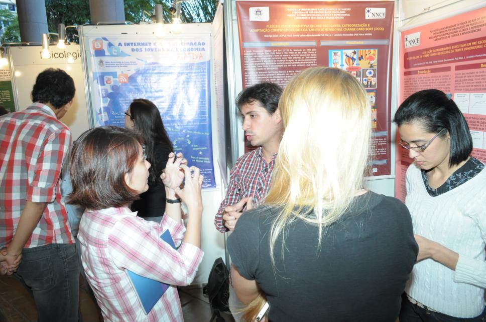 Bolsista de iniciação científica do Departamento de Psicologia durante a apresentação de poster sobre sua pesquisa.