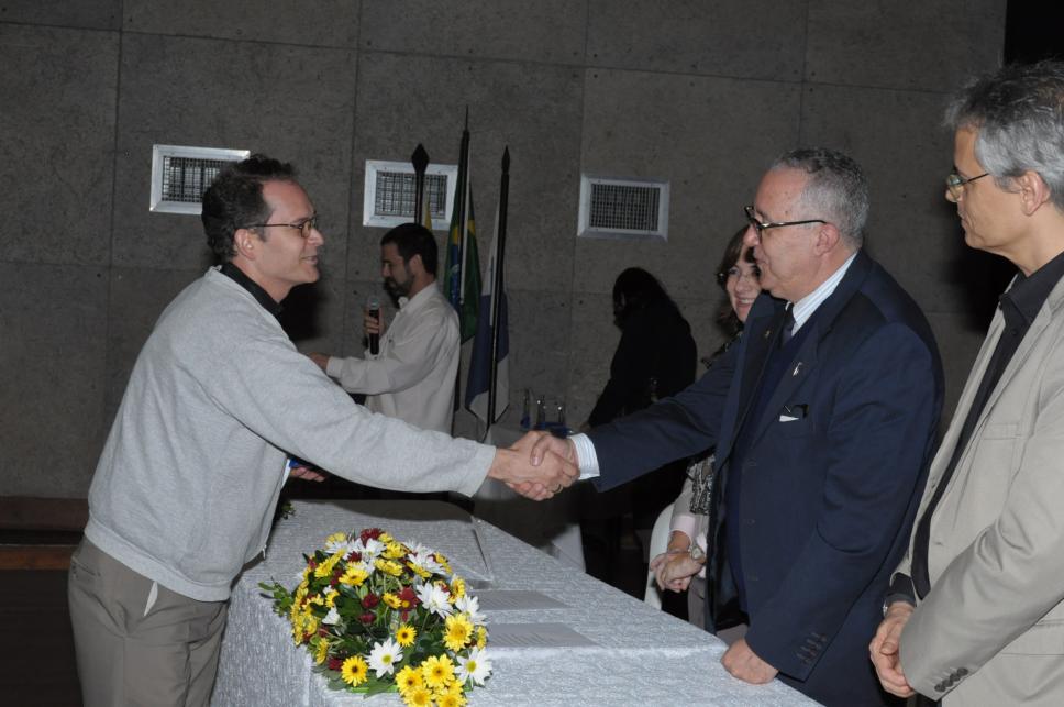 O Reitor Pe. Josafá S.J. parabeniza o professor pelo prêmio recebido.