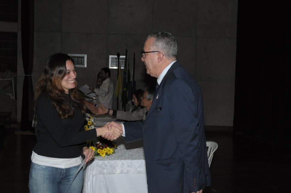 Aluna recebe o certificado de participação no XX Seminário de Iniciação Científica da PUC-Rio e cumprimenta o Reitor Pe. Josafá S.J..