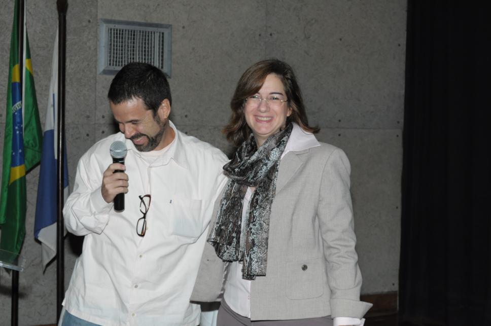 Professor Sidnei Paciornick e a professora Daniela Vargas, homenageada na cerimônia de encerramento do XX Seminário de Iniciação Científica da PUC-Rio.