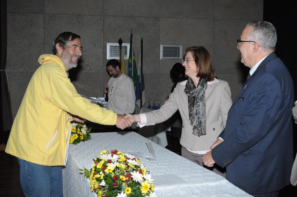 Ao fundo, de camisa branca, prof. Sidnei Paciornik. Da esq. p/ dir., em pé atrás da mesa: profa. Daniela Vargas; Reitor Pe. Josafá Carlos de Siqueira S.J.