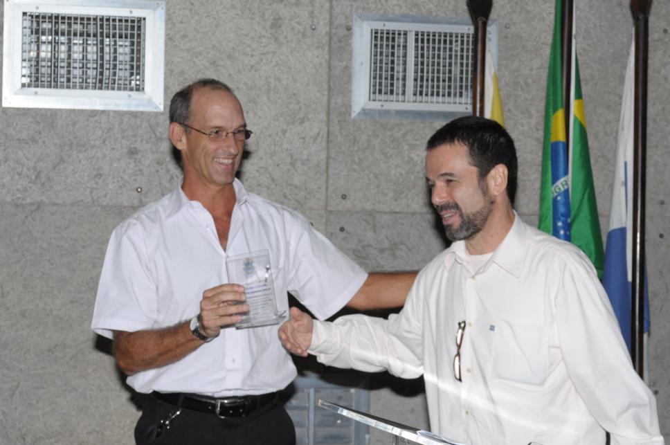 Professor Sidnei Paciornik entrega homenagem para o professor Marcelo Dreux.