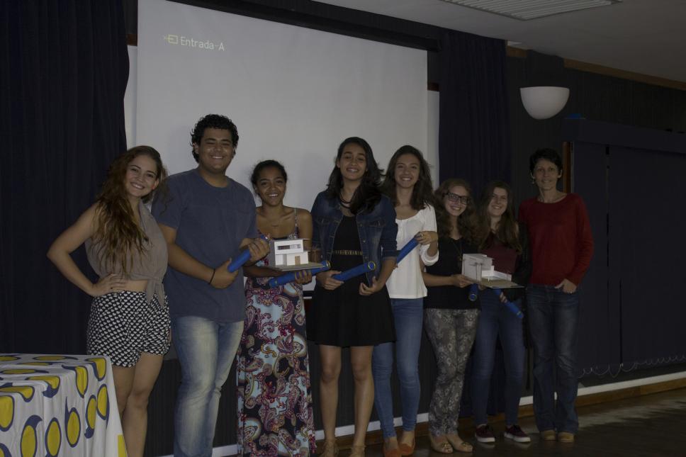 Professora Dely Bentes com alunos do PUC Por Um Semestre participantes do curso "Introdução à Arquitetura e Urbanismo".