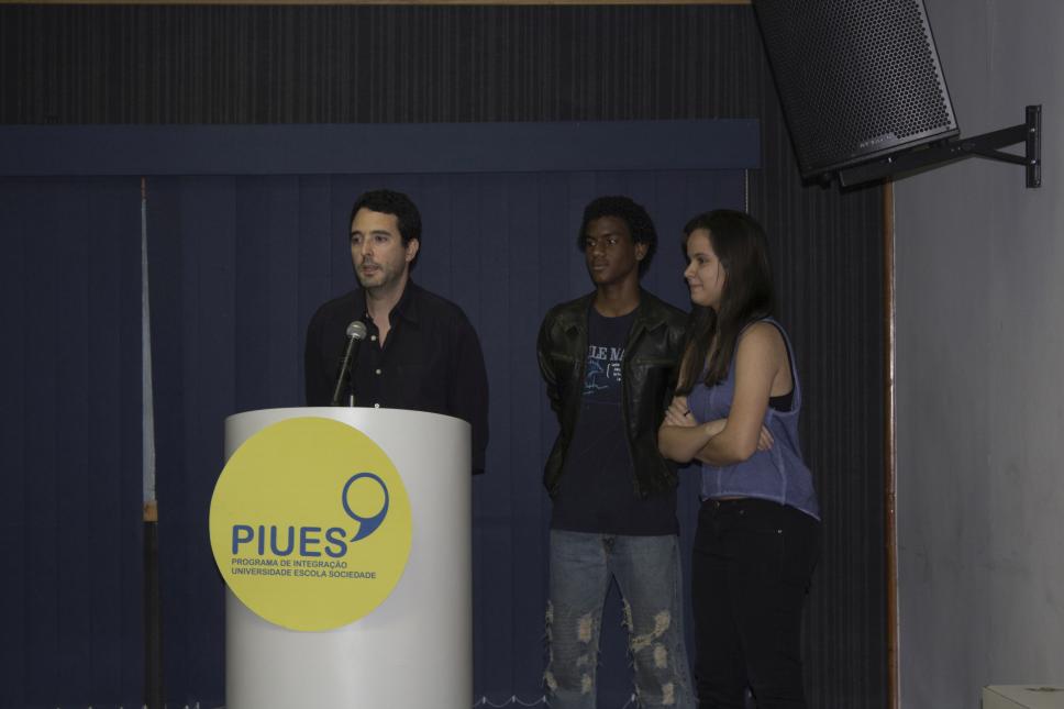 Professor Romulo Mattos em discurso na cerimônia de encerramento. Ao lado, os alunos do PUC Por Um Semestre do curso de "Introdução à História: Conhecendo e debatendo o Brasil Republicano".