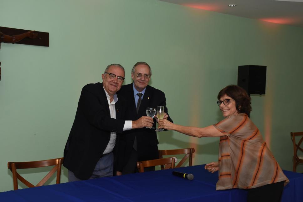 O Reitor Pe. Josafá S.J., o prof. Danilo Marcondes e a profa. Ângela Paiva brindam na comemoração dos 25 anos da CCCI.