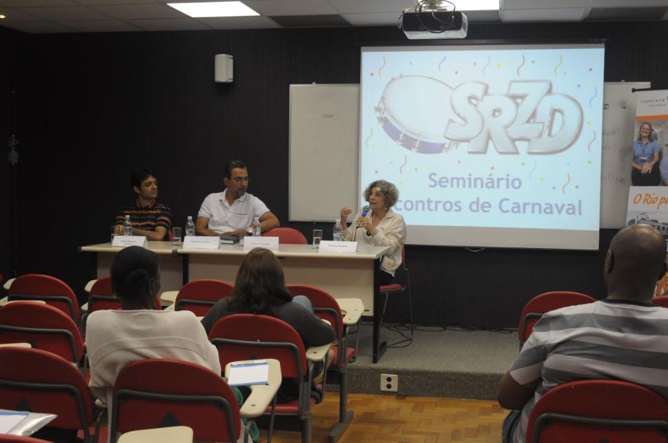 Encontros de Carnaval', evento realizado na sala 102-K do Edifício Kennedy, com a participação de Hélio Ricardo Rainho, do projeto SRZD, Roberto Almeida, vice-presidente administrativo da São Clemente e Raquel Valença, blogueira do projeto SRZD.