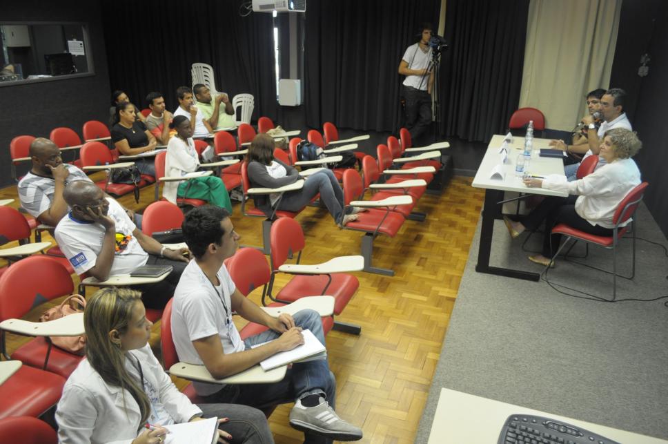 Encontros de Carnaval', evento realizado na sala 102-K do Edifício Kennedy, com a participação de Hélio Ricardo Rainho, do projeto SRZD, Roberto Almeida, vice-presidente administrativo da São Clemente e Raquel Valença, blogueira do projeto SRZD.