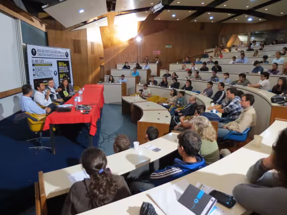 Imagens de uma das mesas-redondas da Semana Global de Empreendedorismo, realizada no Auditório do RDC.