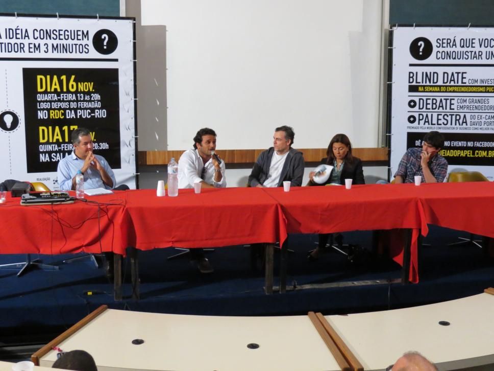 Debate com empreendedores. Profissionais debatendo junto a empreendedores sobre o atual cenário do Empreendedorismo no Brasil atual. Mesa mediada pelo prof. Sérgio Yates.