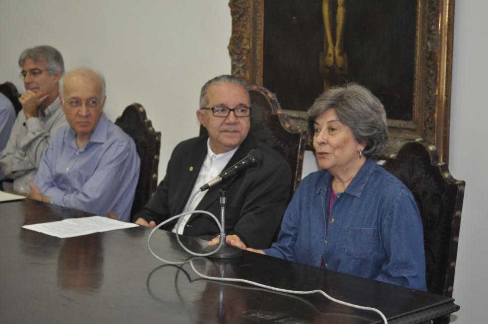 A profa. Angeluccia Habert, ex-diretora do Departamento de Comunicação Social, discursa na cerimônia de posse do novo diretor, prof. César Romero.