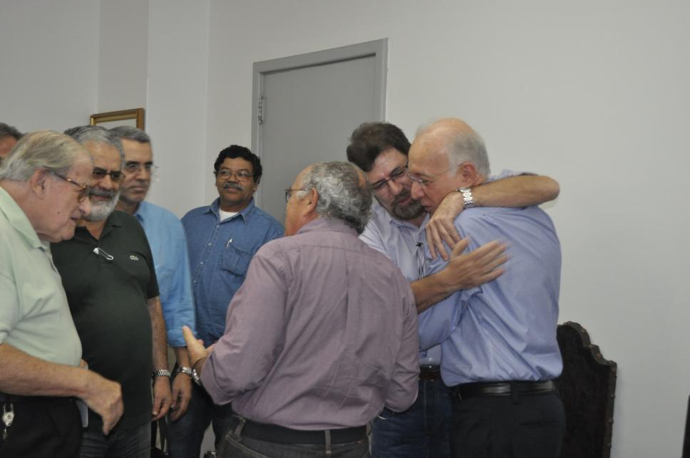 O prof. César Romero é cumprimentado pelos presentes por sua posse como diretor do Departamento de Comunicação Social.
