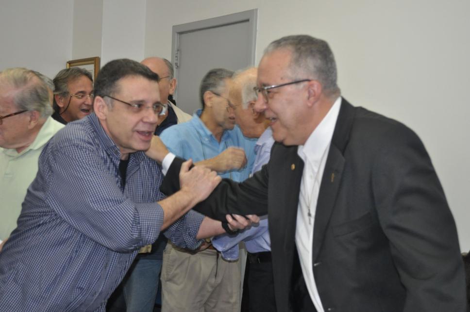 O prof. César Romero é cumprimentado pelos presentes por sua posse como diretor do Departamento de Comunicação Social.